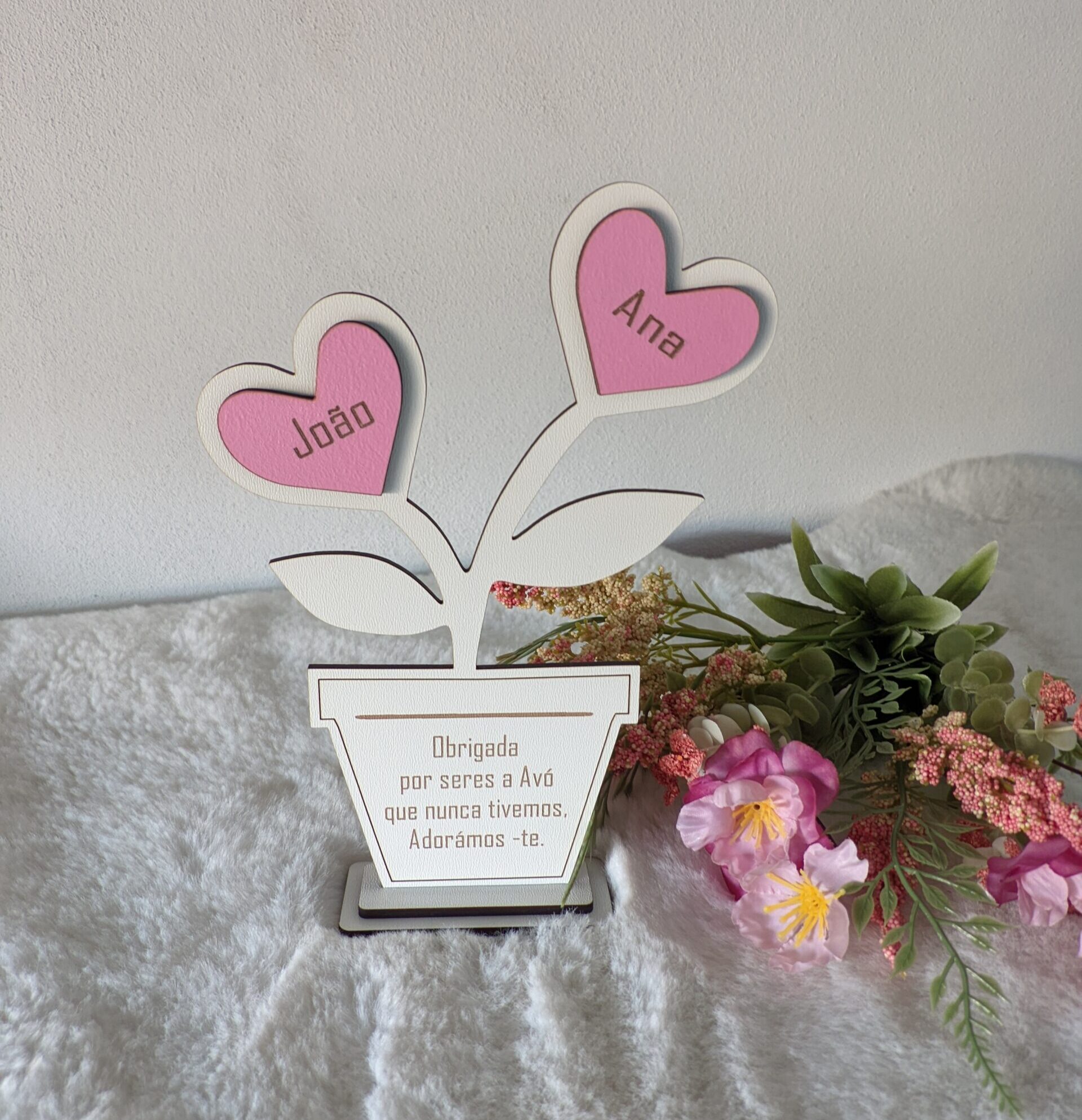 Vaso Personalizado em Mdf Com Flores em forma de Coração com pequeno texto e nome.